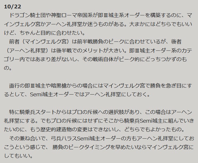 (途中まで同上)、、、アーヘン礼拝堂Ⅱ領主進化、現在は食料6人固定、射手育成所を建設、竜弓兵生産まわし、家1件建設30枠、付近のベリーに粉ひき所を建設、、、Semi城主キャンセル追加軍生産していきたいと思ったら、即Ⅲ城主オーダー特有の畑作成予定をキャンセルする、例えば戦士育成所建設、初期竜軍兵生産まわし、それに伴い食料8?人採掘4?人追加して合計食料14人採掘4人固定、食料採集テク園芸、伐採テク(金が貯まってから及び充分に伐採人員が増えてから?)、家を建てていく、木材および伐採人員が充分なら採掘に2~4?人追加して合計6人、採掘テク、手押し車テク、織物テク、