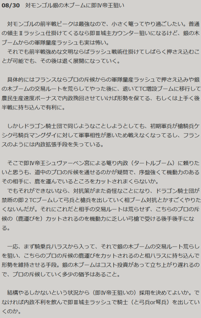 採石場を完全封鎖できた場合(これで相手は即2TCできず)にはプロの斥候挟まないでそのままラッシュ戦術を仕掛けてもいい。但し、即Ⅲ城主カウンターを狙われた場合にはプロの斥候で内政配慮しないと形勢を保てないし(そんなことないが有利は取れない)、追って城主Ⅲ進化させていくルートもある。