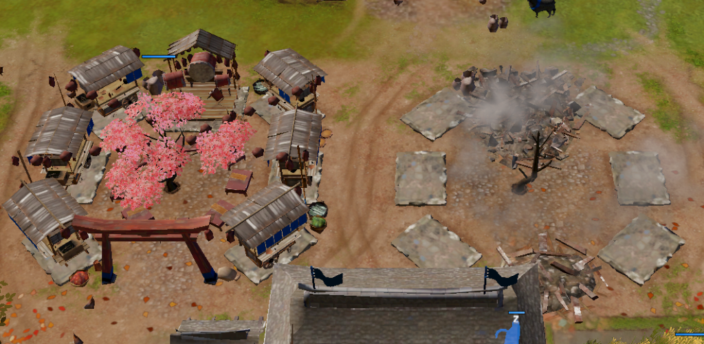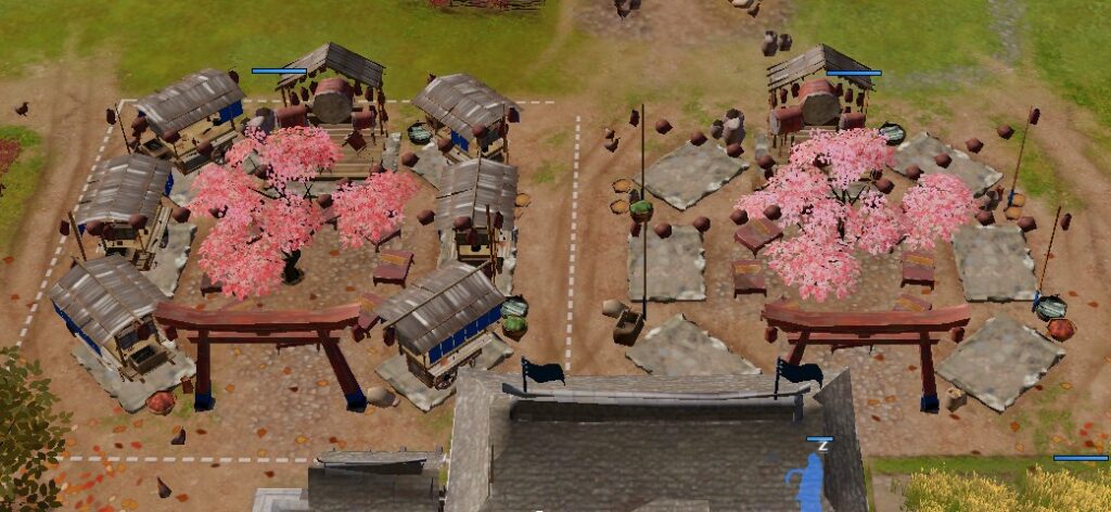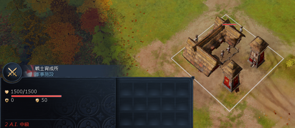初手は弓兵ハラスから打診を行って相手の動向を窺い、そしたら戦士育成所を建設してきたので武士で受けるつもりなんだろう。それが分かったところで、その軍対抗される前に手を引っ込めて自陣まで戻した。