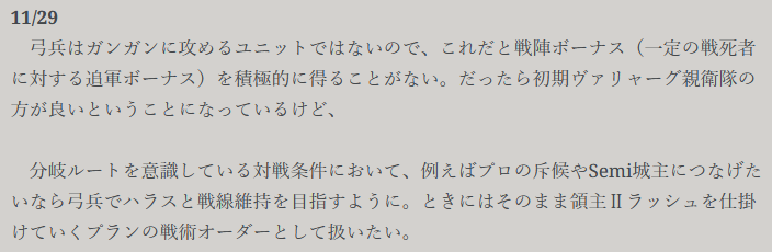 12/16追記)思い直して対戦模様の動画化まで行った。こちらのやりたいことは予定通りに進められてるのでいいかなと思って。初手の弓ハラスが相手を硬直させ、それでⅡ受け体制を築いたものの城主Ⅲ進化されて(ここからの判断ができずに)身動き取れなくなった結果のようにも。そこまでのラッシュ偽装効果を得るものだとはこちらも思っていなかった、Semi城主の手口なんてもうバレバレの前提で進めている。Semi城主に組むときは直行の即Ⅲ城主してくる相手を予想している場合が多いし。相手に軍対抗される前に弓ハラスの姿を消してやったことで、こちらの出方が分からなくなって不安要素をうまく与えたことになったか。