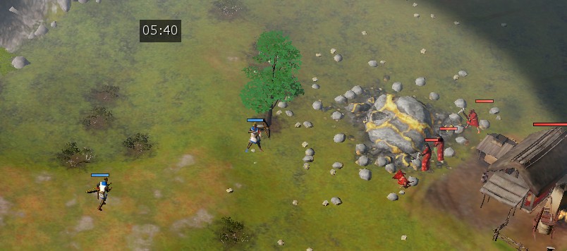 そしたらあとで騎乗兵が出てきてノーガードの弓兵が喰われていくことに。その兵舎を偵察できなかったなぁ、上手いとこに建設してたのか。いや実はリプレイを観ると偵察できてたんだけど、試合中に自分がそれを確認できなかった、斥候の自動巡回だから。弓兵を分隊させてたのが結果的に被害を抑えることができ、中央の弓兵2体はその間に自陣に戻していった。