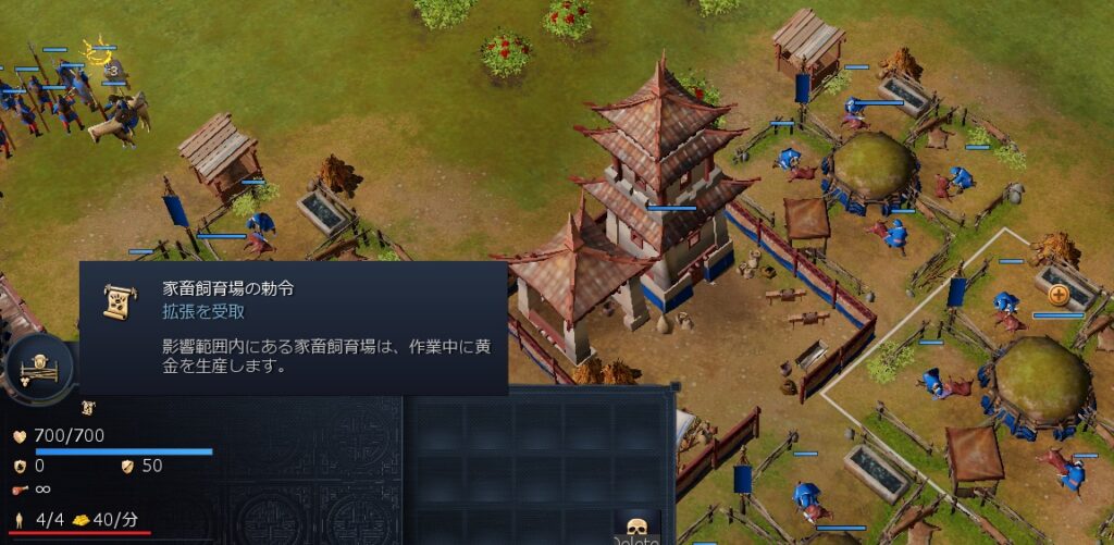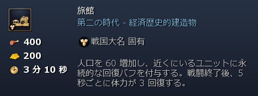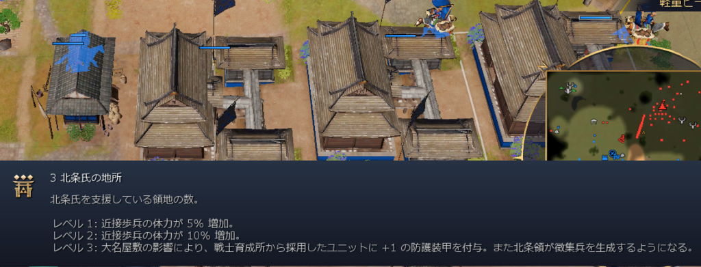 それと大名屋敷を3つ揃えると徴兵できるようになり、日本文明の種子島鉄砲鍛冶(帝王Ⅳ時代の歴史的建造物)みたくストックされて好きなときに放出できる。逆に言えば勝手に生産されない。それは一種類の大名屋敷に限る。