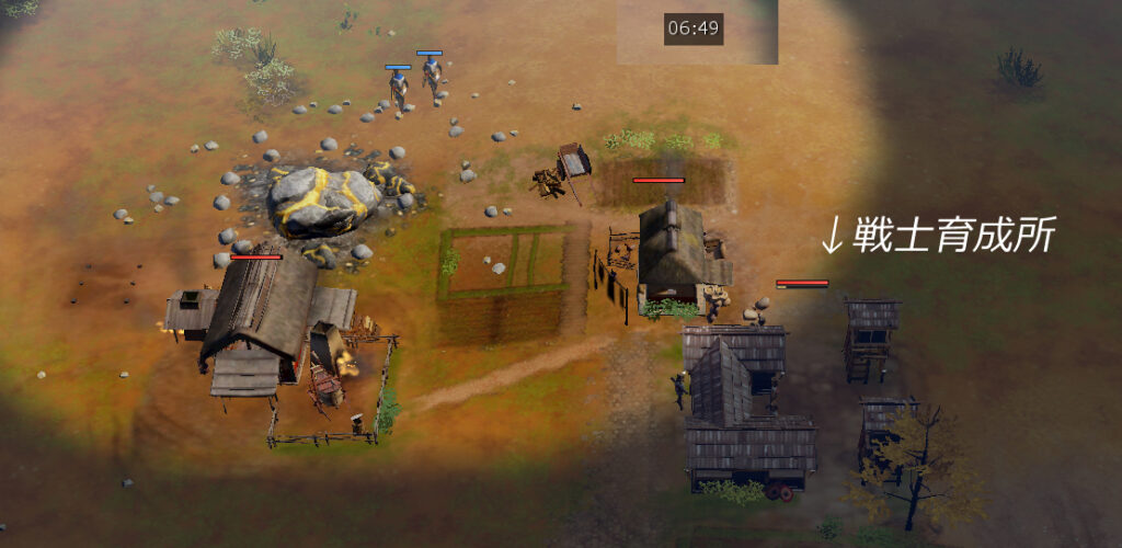 戦士育成所が建っていたが、ここから(即2TCブームじゃなくても)ホスピタル騎士が出てきて対応されるのだろうと最初に思って、出てくるまでの間は荒らしてやろうと分隊させて周辺も回っていった。軍兵タイプなら機動力低い相手だからそれができる。