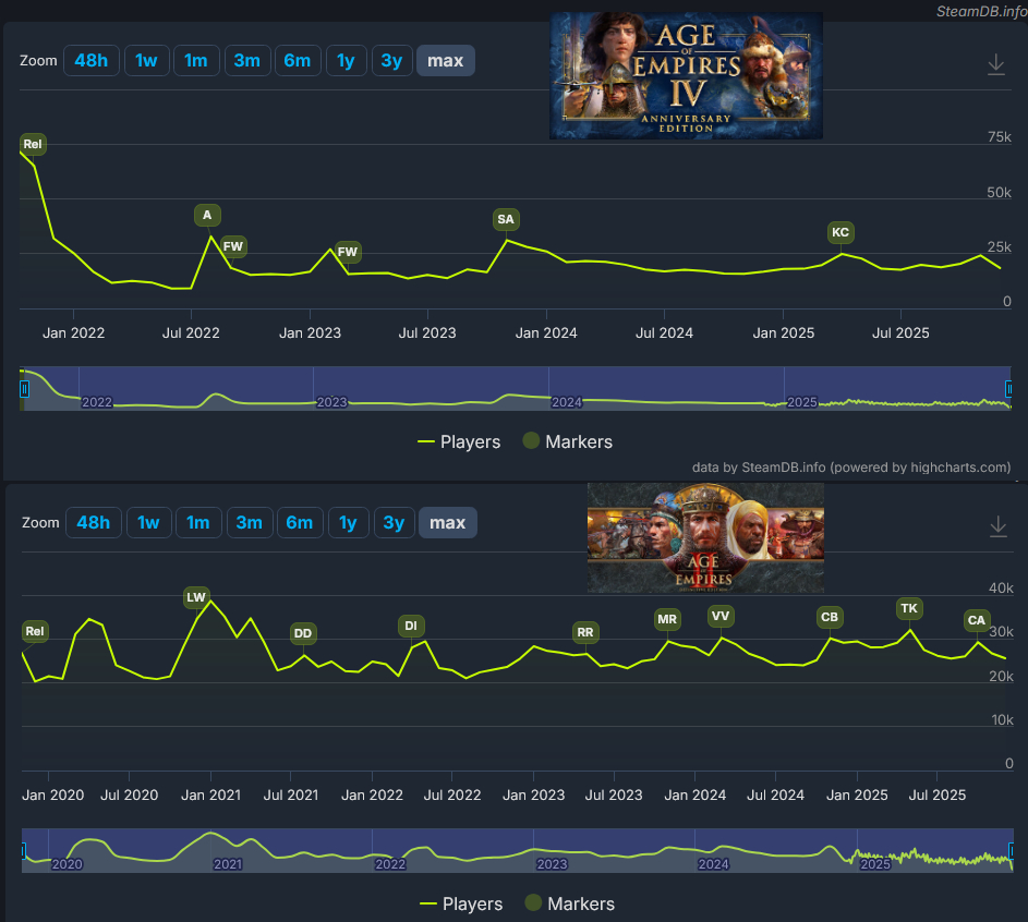 AoE4は近年では同時接続プレイヤー人口のピーク平均が約20000人。ちなみにAoE2DEは27000人ぐらい。