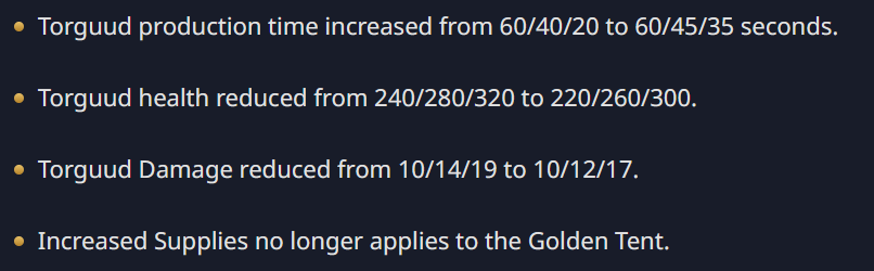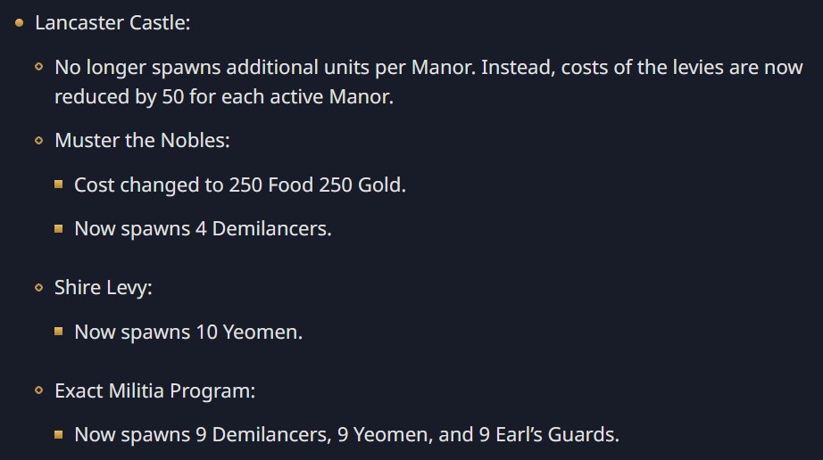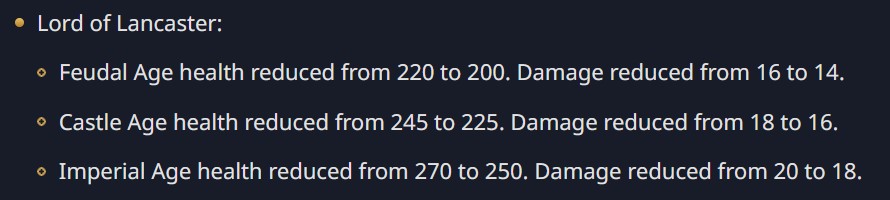 ランカスター家は前パッチで頭一つ抜けてたし、今度のパッチでナーフになりそうだと思ったら、召集兵デミランサー騎士を出しづらくされた点では痛いが、実は内政面でナーフになってない意見も聞き、前までと形を変えればやっていけそう。