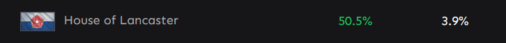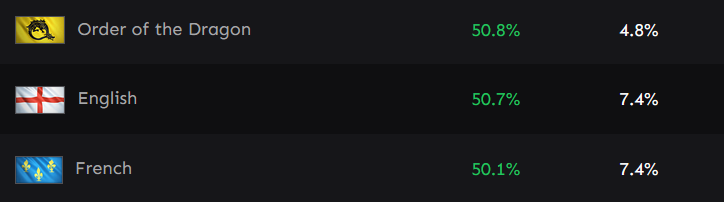 前まで有力だったランカスター家の勝率が低下。前パッチから導入されたマナーハウスの狭間陣地がなくなったってことないよな。ちょっと細かい変更点の調査はできてないので勝率低下の原因はまだ突き止められない。序盤に召集兵の5デミランサー騎士を出せるようになって自由度や扱いやすくなるなと思っていたのに。