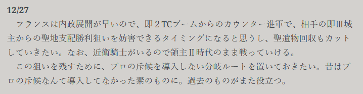対テンプル騎士団のセルジェアントのメタで弓兵スタート狙いしていくのに、もう1つ有力なホスピタル騎士団即2TCブームにもまぁまぁ対応できるから(弓兵ハラス追加初期軍兵で)、メタ読みでフランス王国同盟の従騎士スタートをマークしないという話なら、それで進めてもいい。全般に対する安定路線は初期軍兵スタートだけど。それと相手側もよもや(初期軍兵文明の)神聖ローマ帝国系が弓兵スタートなんかしてこようとは思わない。