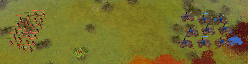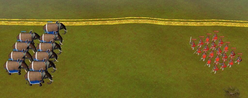 低コストユニットの大軍で攻撃しようとするとその自軍同士が障害物となり迂回してしまって攻撃を与えづらくなるので、高コストユニットで数を少なくできる方が有利であるかの検証。