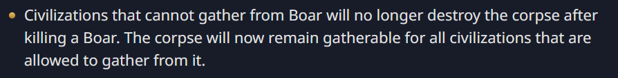 もしイングランドが狩猟遠征するなら、そこに前哨地を建てる代わりに軍兵で焚き火を燃やし、視界確保と狩猟効率アップを狙うのも良いことに。まぁ畑作ボーナス文明が狩猟遠征する機会はあまりないとしても。