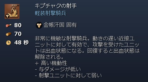 金帳汗国が初手弓兵生産になりやすいのは、例のベリーや放羊の採集効率がノーマルなため、効率アップできる鹿肉や家畜を調達できるようになるまでは伐採に偏らせておきたいから。また立ち上がり遅れる文明なので初動受けていくには射撃兵が有効。モンゴルのように騎兵スタートになりづらいがしかし黄金のテントからハーンとトルグートを少しだけ出すことはできる。
