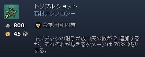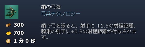 通常兵舎および射手育成所からのはやっぱり対象外だった。兵舎を増設して終盤戦でロングボウ大量生産したいときには効果影響に乏しくなると。