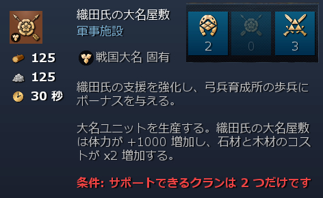 戦士育成所(北条氏)と騎士育成所(武田氏)のを建設したあとに射手育成所(織田氏)の大名屋敷は建設できなかった。強化させる兵科を選ぶことになるのか。ところで「クラン」と言われても馴染めない、日本文化なんだし「一族」や「血族」みたいに言ってほしかった。