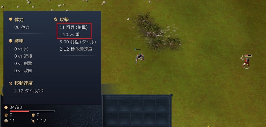弩兵の攻撃力が11で、その対重装アンチダメージボーナスが+10なので、射撃装甲0のセルジェアントに対して21のダメージを与えられるだろうとするところ、実際にそのようになった。