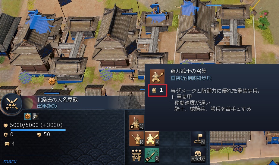 それと大名屋敷を3つ揃えると徴兵できるようになり、日本文明の種子島鉄砲鍛冶(帝王Ⅳ時代の歴史的建造物)みたくストックされて好きなときに放出できる。逆に言えば勝手に生産されない。それは一種類の大名屋敷に限る。