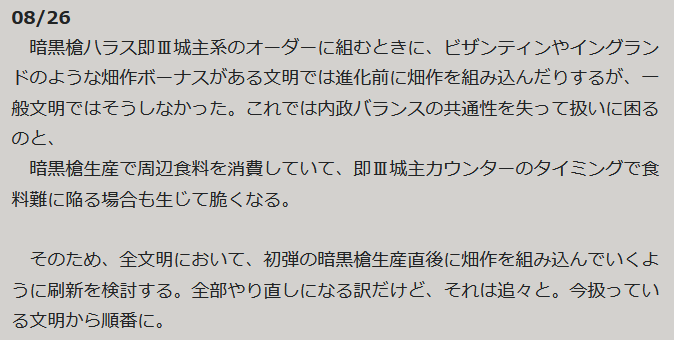 ※ 08/26 初弾の暗黒槍生産直後に畑作を組み込むオーダーはまだ手付かずの状態(ここでは)。