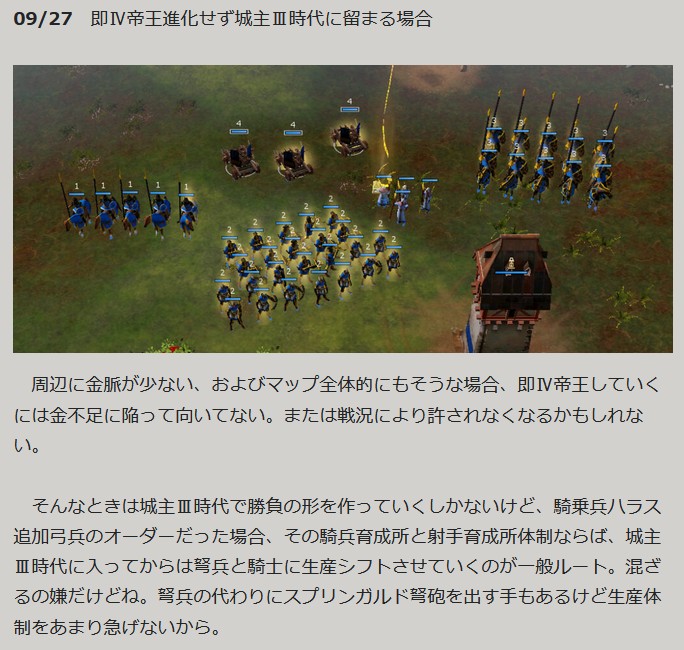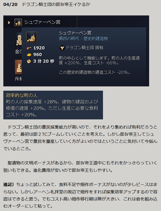 (理想手順は)Ⅳ進化中に、伐採に8?人ほど充てる、伐採テク、採掘に20?人ほど充てる、射手育成所を2つ建設、家を建てていく、シュヴァーベン宮Ⅳ帝王進化、シュヴァーベン宮TCで金ピカ農民大量生産ブーム、竜騎士と竜砲撃手2小屋まわし、(余裕があれば)納所テク、司教生産まわし、戦士の鼓舞テク、竜騎士強化の軍馬テク、竜騎士がたまってきたら精鋭化アップグレード、