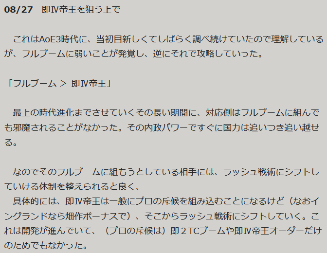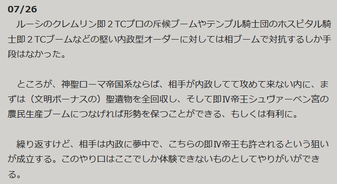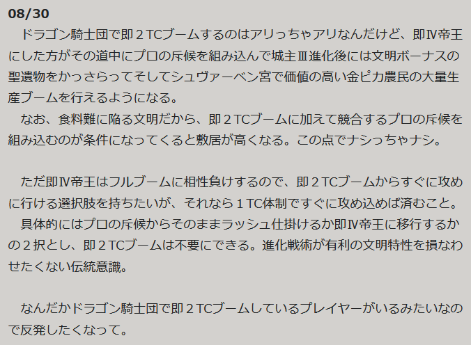 ちょっともっかいやり直す。つい最近の考察を忘れて、今との相違が生じていたからで、ドラゴン騎士団がプロの斥候するなら即ハラススタートに限るのが良さそうなのと、即2TCブーム(もしくは恐怖のフルブーム)に対して即Ⅳ帝王シュヴァーベン宮で果たして内政追い付くのだろうかと(これはひとまず不問にしておきたい)。