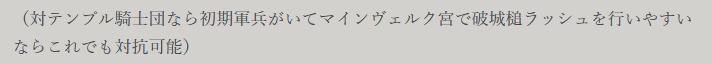 魚鱗テクで竜弓兵を強化できるから、弩兵はあまり出さずに、軍兵対抗は騎士やスプリンガルド弩砲に任せたいという事情はある。