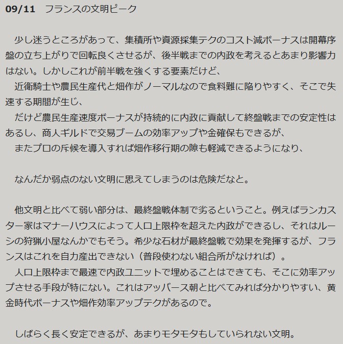 複数TCからの農民生産ブームで農民生産速度ボーナスを活かせようが、終盤向けの内政ボーナスは特になく、畑移行期からは失速するだろう。アーバレトリエ弩兵や近衛カルバリンなどの強力なユニットはいようが。そのようなフランスのピークを考えると帝王Ⅳ入りさせるときには前線に砦の機能を持つ赤の宮殿の歴史的建造物を建てに行きたい気持ちも分かる。