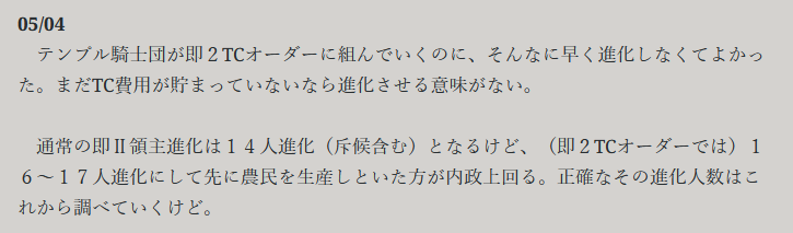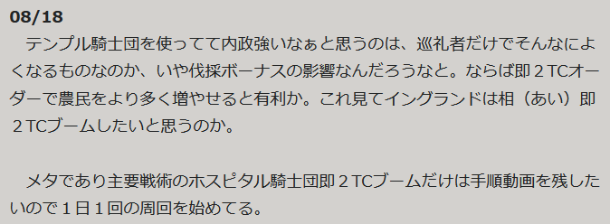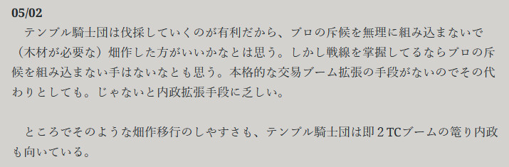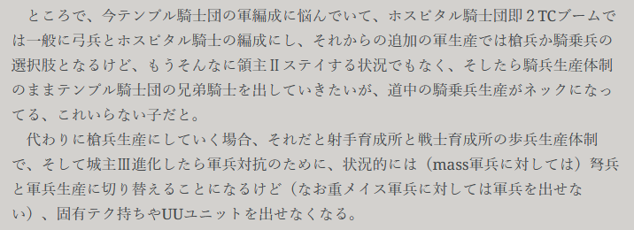 (もう1つの選択肢とする軍編成は追加槍兵。こうしていく場合には、射手育成所と戦士育成所を追加建設2つ目ずつ、弓兵と槍兵2小屋まわし、たまにホスピタル騎士生産も混ぜる、それに伴い食料採集人員4~6?名)