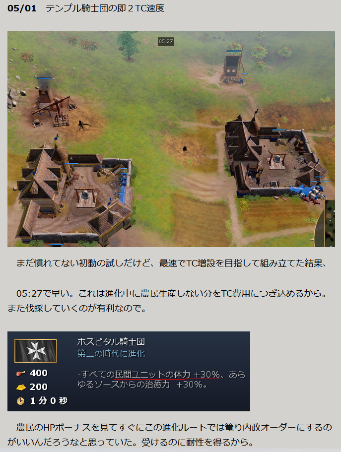 羊を採集していく、採掘に2人充てそこに採掘所を建設、家1件建設20枠(採掘人員によって)、200金分が貯まったら採掘を止めて伐採に移す、人口16まで農民を予約生産、進化費用が貯まったらホスピタル騎士団と同盟を結ぶ、16人進化(斥候含む)、農民すべて伐採に移す、木材が貯まったら採石に9人充てそこに集積所を建設、ホスピタル騎士団Ⅱ領主進化、(注:現在はTCからの農民生産は食料採集に充てていってる)、350石分が貯まったら採石を止めて伐採に移す、TC費用が貯まったら農民6人で適所に増設(あとで採掘に移す)、(TC建設中すぐに)伐採人員3名減らして食料採集に移す、複数TCからの農民生産ブーム、現在は伐採6人採掘6人固定、木材が貯まったら例えば射手育成所と戦士育成所を建設、弓兵とホスピタル騎士生産まわし、付近のベリーに粉ひき所を建設、食料採集テク園芸、家を建てていく(正確なタイミング調査中)、食料採集人員16名に達したらTCからの農民生産は伐採に充てていく、木材および伐採人員が充分なら採掘に4名追加して合計10人、採掘テク、手押し車テク、織物テク、巡礼者召喚で安全な航路テクに聖域テク、