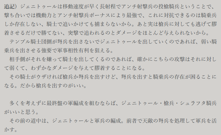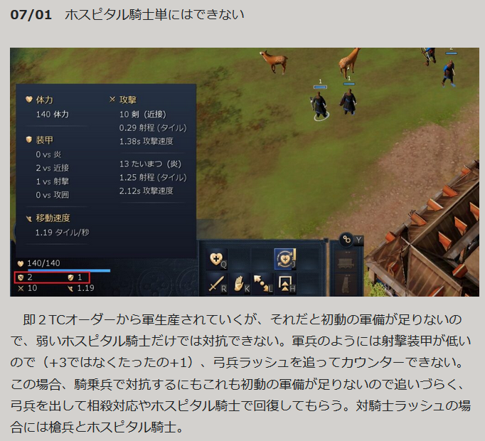 追記08/19)ところがユニットテストで調べた結果、ホスピタル騎士が軍兵や弓兵にも勝てるという壊れユニットだった。S Tierユニットだと騒がれる訳だわ。HPが高いのが原因のよう。さらには回復能力もあっておかしい。いずれナーフ調整されると信じたいが。ちゃんとバランス調整されたら、上で言われてる事情になってくると思うけど。