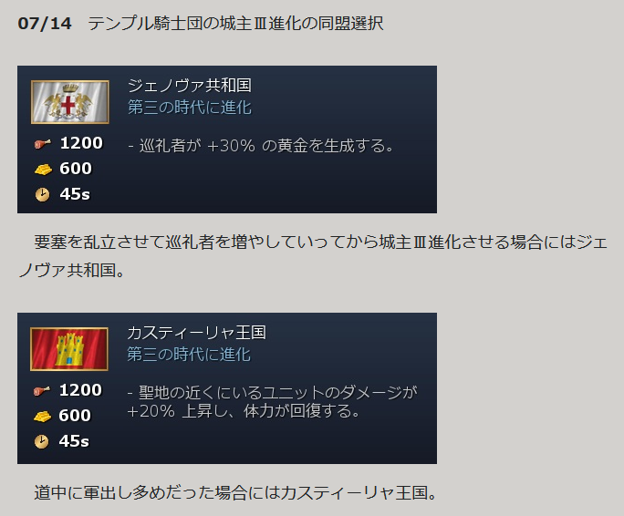 カスティーリャ王国Ⅲ城主進化、領主Ⅱ時代からの軍ユニットが多く残っていたらベテラン化、例えば今は射手育成所と戦士育成所の2小屋体制として、軍兵(もしくはホスピタル騎士)とジェニトゥール投槍騎兵2小屋まわし、要塞で財宝の塔テク、要塞のオーラ範囲に修道所を建設(財宝の塔テクで金収入効率アップさせるため)、聖職者を生産し聖遺物回収や聖地支配狙い、