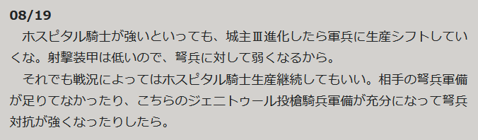 領主Ⅱ時代に弓兵とホスピタル騎士から追加2小屋騎乗兵生産で同ユニットがたまったときには、城主Ⅲ入りさせてからは軍兵生産していけばうまく軍編成を組める。ホスピタル騎士もやや軍兵もどきだ。